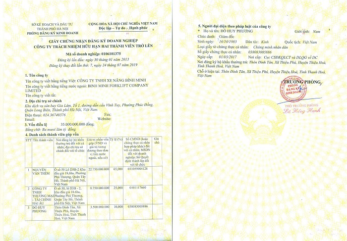 - Tới hết năm 2019 Xe Nâng Bình Minh trở thành đơn vị phân phối xe nâng hàng mới lớn nhất Việt Nam với vốn điều lệ là 35 tỷ đồng.
